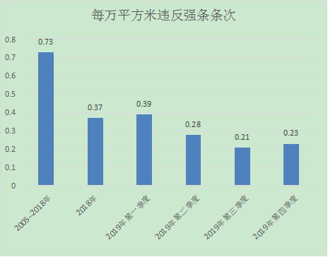 2019年第四季度我中心施工圖審查總建筑面積為278萬㎡,共審查出違反強(qiáng)制性條文64條,每萬平米違反強(qiáng)條0.23條次,與往年對比分析如下:
